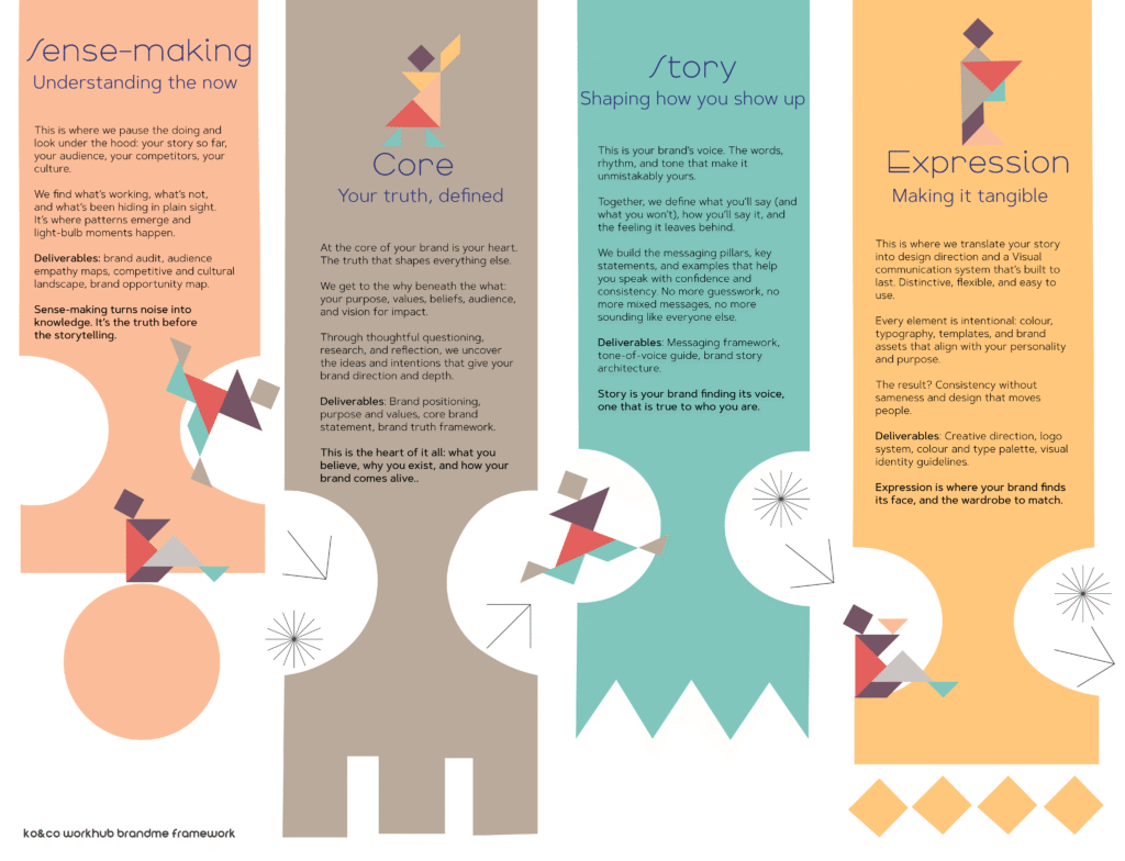 At ko&co, we help small businesses make sense of who they are, so that their brand helps everything else click into place. Our Brand Me Framework gives you the antidote to scattered guesswork and provides your with a structured, science meets creativity process that helps you understand and own your brand.